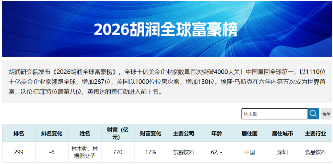 2026年3月5日,胡润谋划院发布《2026胡润全球富豪榜》,林木勤、林煜鹏父子以770亿排行第299位;而在2025年10月28日,胡润百富发布的《2025年胡润百富榜》上,林木勤、林煜鹏父子其时的钞票值是910亿元,短短4个多月,钞票值缩水140亿元。
