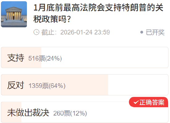 最高法院关税政策:64% 用户猜 “反对”,现实却是“未裁决”。最高法院对特朗普关税政策成为唯一偏差:64% 的用户认为最高法院会反对特朗普的关税政策,但最终结果为 “未做出裁决”,凸显了此类政治事件的高度不确定性。