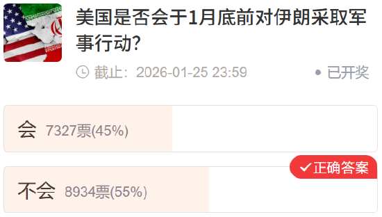和资产预判看涨情绪的“翻车”不同,在三大国际事件的判断上,多数用户拿捏到位。面对中东紧张局势,55%的用户跳出情绪干扰,冷静判断美国不会在 1 月底前采取军事行动