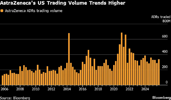 近年来英国企业美国存托凭证的交易量大幅攀升。彭博社汇总数据显示,2019年至2024年间,富时100指数成分股中20家拥有美国存托凭证的公司,其相关交易量增幅超80%。