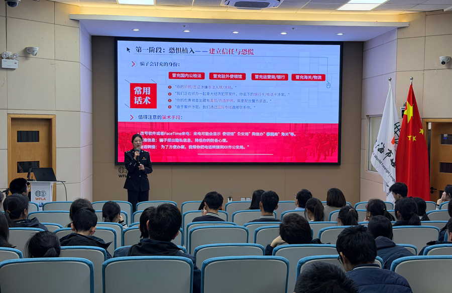 “如今在我们看来有些不可思议的诈骗套路,为什么当事人会深信不疑呢?”洪雅虹告诉同学们,犯罪分子首先冒充权威机构施压,刻意制造恐慌情绪;随后又会切断留学生与外界的联系,将留学生困于“信息茧房”。