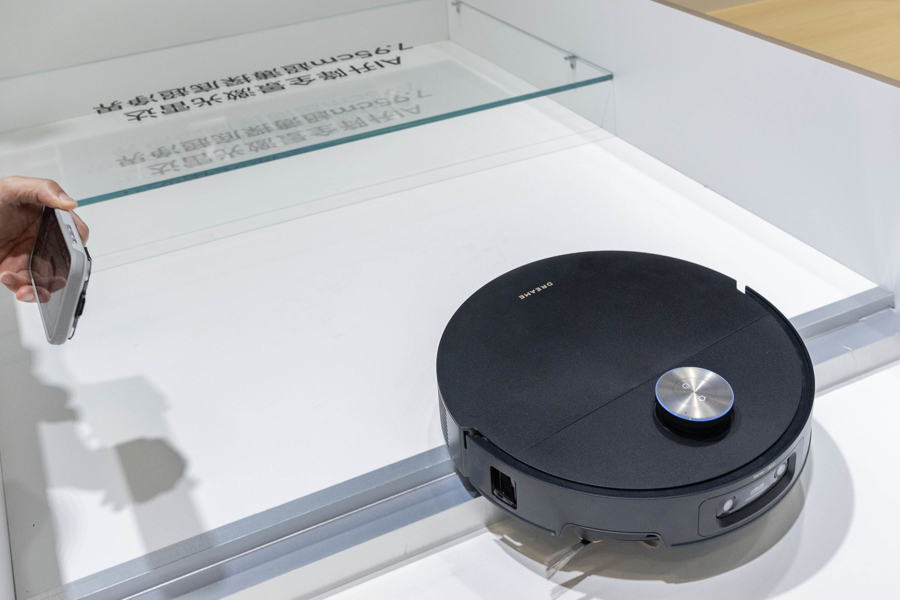 一款成就有仿期许械足的扫地机器东说念主正在扮演提高台阶的技巧。