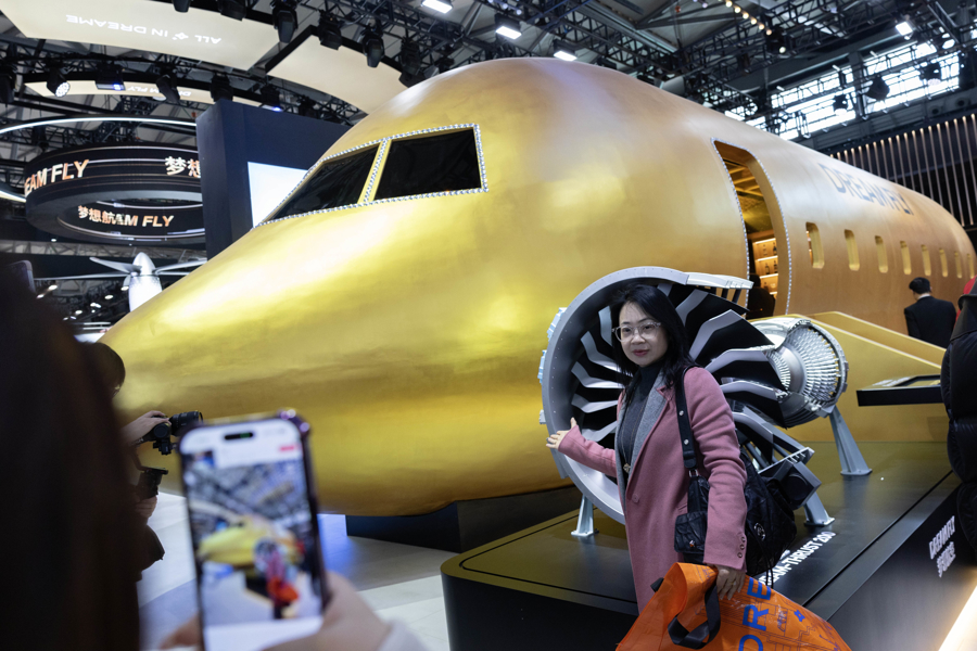 又名不雅众在商务机体验区拍照。