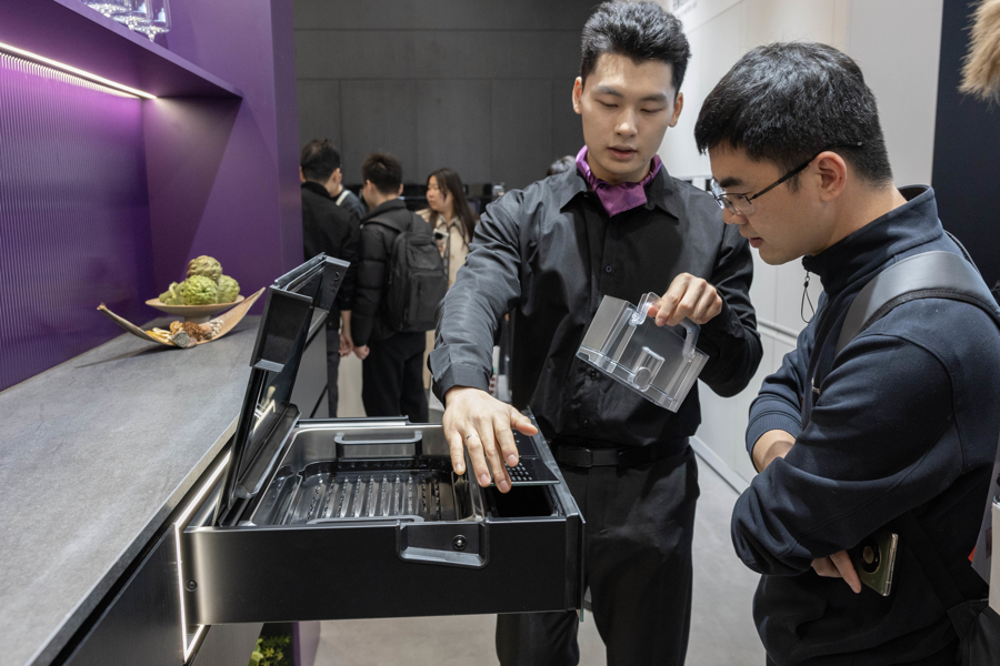 职责主说念主员向不雅众先容一款博世超薄14.1cm抽屉蒸箱。
