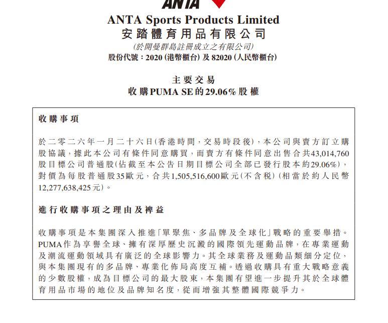 1月27日,安踏体育用品有限公司宣布,已与 Pinault 家族旗下投资公司 Groupe Artémis 达成购股协议,将以15亿欧元现金收购全球知名运动品牌彪马(PUMA)母公司 PUMA SE 29.06% 的股权。交易完成后,安踏将成为彪马的最大单一股东。本次收购资金全部来自安踏集团自有现金储备。