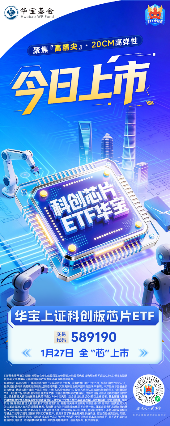 作为中国经济未来发展的战略指引,已发布的“十五五”规划建议全文强调,采取超常规措施,全链条推动集成电路、工业母机、高端仪器、基础软件、先进材料、生物制造等重点领域关键核心技术攻关取得决定性突破;明确推动量子科技、生物制造、氢能和核聚变能、脑机接口、具身智能、第六代移动通信等成为新的经济增长点;要求全面实施“人工智能+”行动,抢占人工智能产业应用制高点,全方位赋能千行百业。相关表述将中国芯片产业成长空间强力推升到了“决定性突破”的新高度。千亿规模ETF大厂——华宝基金旗下重磅新品——科创芯片ETF华宝(589190)今日(1月27日)正式上市交易,该基金跟踪上证科创板芯片指数,其标的指数由科创板50只业务涉及半导体材料和设备、芯片设计、芯片制造、芯片封装和测试的硬科技公司构成成份股组合,将为投资者参与把握国产芯片产业链的“中国硬科技核心资产”投资机遇提供又一重磅ETF工具。