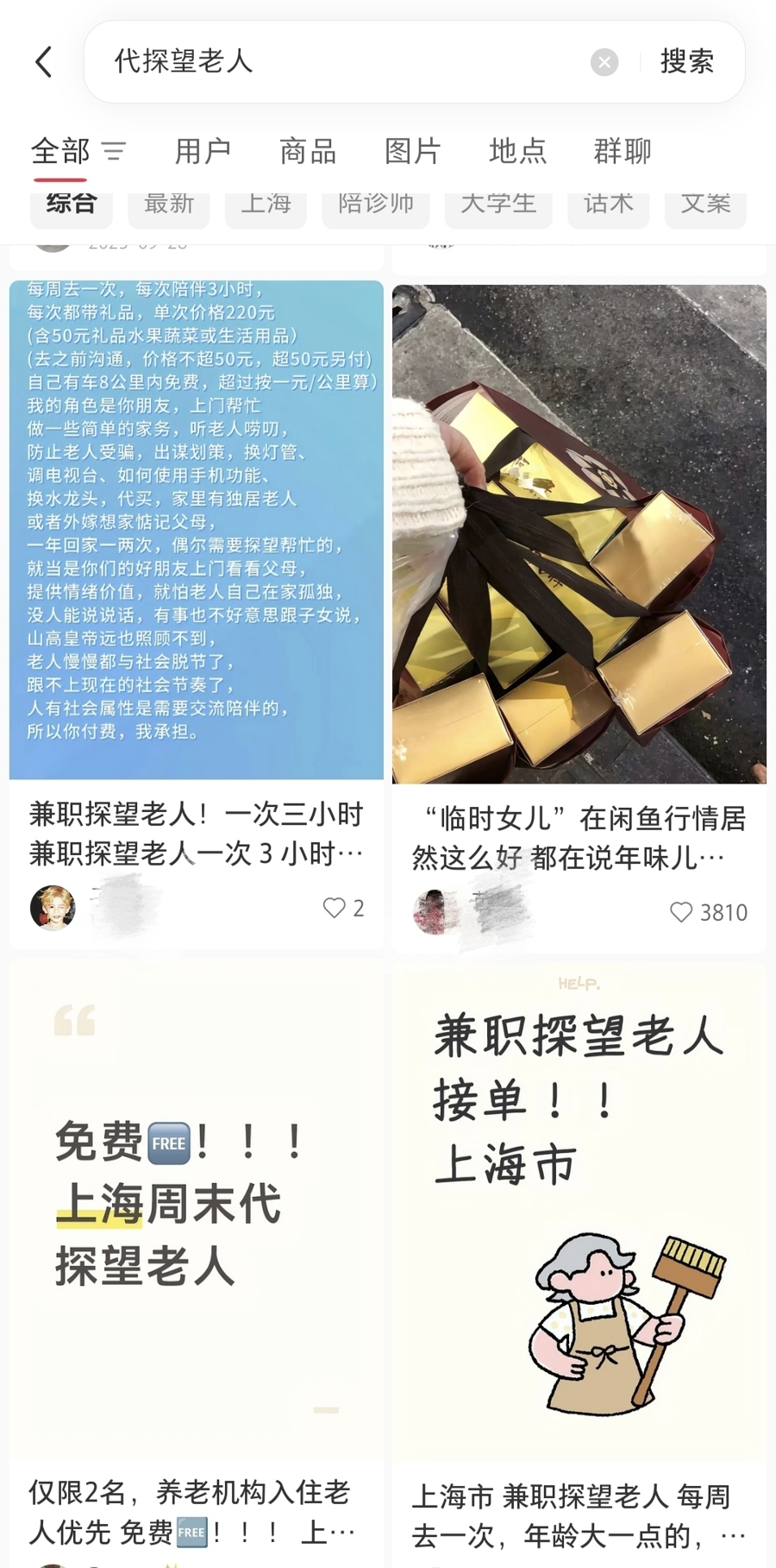 酬酢平台上有不少东谈主发布代探望办事。